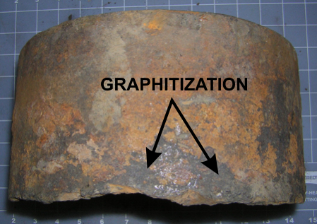 The corrosion mechanism itself is of interest. Gray cast iron is used for pipes due to it's inherent resistance to corrosion. This resistance is due largely to the graphite matrix that forms during the casting process, and is interwoven with a matrix of pure iron. Graphitization corrosion occurs when the iron surrounding the graphite is attacked. The porous graphite matrix is left intact as black patches on the surface of the pipe. This corrosion mechanism, which is specific to gray cast iron, may give the false appearance of a structurally sound material. Unfortunately, the porous graphite has little strength, and makes the pipe prone to cracking under low external stresses.