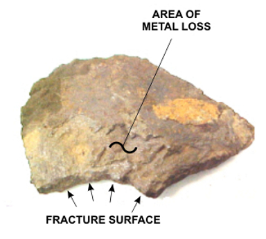 The chemistry of the fragments are typical of cast iron piping material, so material defects are not the likely cause of the failures. Cast irons are brittle by nature and are more fracture sensitive than wrought materials. Based on the significant corrosion and material loss on the exterior of the pipe, the fracture most likely initiated at an area of reduced cross-section, and may have been caused by internal (water pressure) forces, or by some external force including, but not limited to, nearby construction activity, expansion and contraction of the soil, erosion and/or settlement of the soil surrounding the pipe.