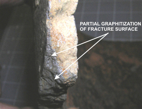 A typical fracture surface with severe loss of pipe wall thickness due to graphitization corrosion is depicted in Photo 4. A rough-polished cross section with the same type of corrosion through the entire pipe wall (dark area denoted with arrow) is presented in Photo 5.