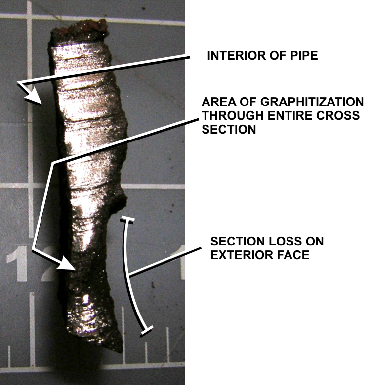 The corrosion mechanism itself is of interest. Gray cast iron is used for pipes due to it's inherent resistance to corrosion. This resistance is due largely to the graphite matrix that forms during the casting process, and is interwoven with a matrix of pure iron. Graphitization corrosion occurs when the iron surrounding the graphite is attacked. The porous graphite matrix is left intact as black patches on the surface of the pipe. This corrosion mechanism, which is specific to gray cast iron, may give the false appearance of a structurally sound material. Unfortunately, the porous graphite has little strength, and makes the pipe prone to cracking under low external stresses.