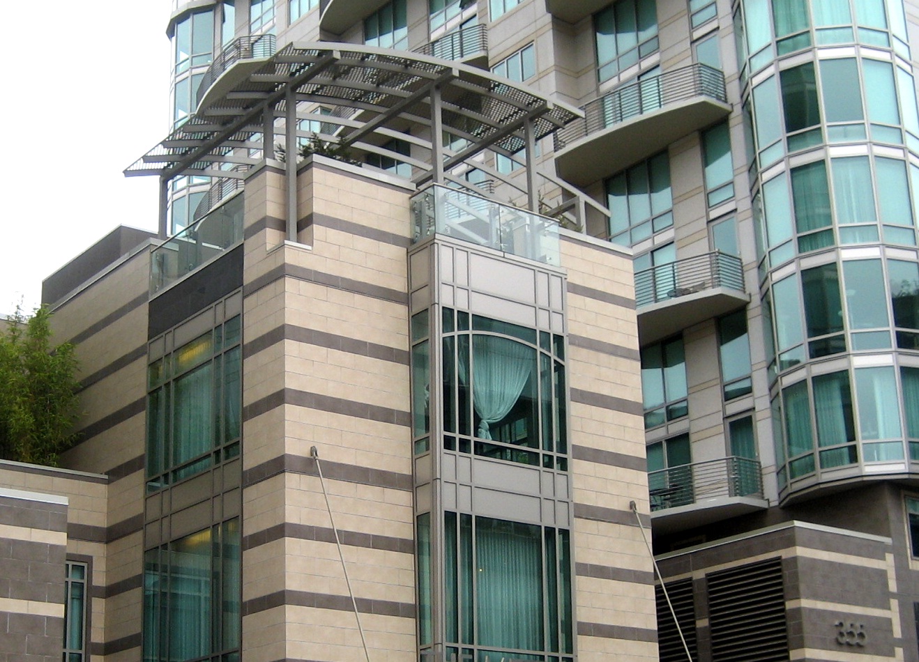 Stone veneer on high-rise building were tested for strength of anchorage prior to installation.